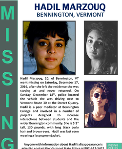 Hadil Marzouq is a 20 year-old woman from Palestine who went missing in the city of Bennington, Vermont. [2]