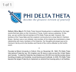 On May 1, 2017,Brown was fatally stabbed in the University of Texas at Austin Stabbing Attack 2017.