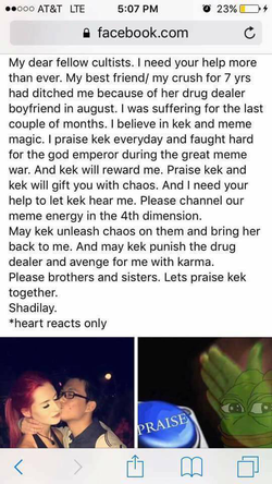 In December of 2016, Shen posted in the Cult of Kek Facebook group that his best friend/crush of 7 years, Shannon Kearns, ditched him for a Drug dealer boyfriend. He pleaded with members of the group to praise Kek and use Meme Magic to bring her back to him.