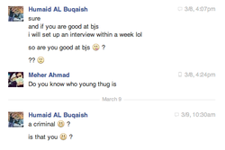According to Ahmad, his messages were "suspiciously laced with grinning, blushing, and winking emoticons" and suggested that he could pay for her flight to his hometown of Dubai; [12]she allegedly requested to have an email interview or a conversation over Skype. [16]According to her, they skyped briefly to make sure she wasn't communicating with someone on a catfish account. [16]He allegedly said they have to be quiet because wife was there. [16]