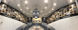 Photo taken inside of the lobby of the I Promise School. The 114 Game worn shoes by LeBron James can be seen along the walls.
