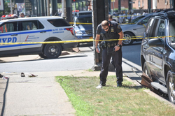 Cops and witnesses described the shooter as tall and Hispanic, carrying a large handgun, and wearing a dark blue shirt and short pants.