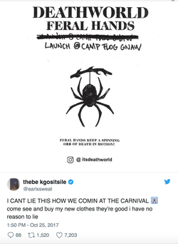 Citation Linkywqaugeunhowzrcj.public.blob.vercel-storage.comThe tweet about the launching of his clothing brand, Deathworld.