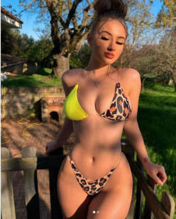 Iulia rocked a Cheetah -print bikini from an unknown brand. The triangle top featured padded cups — one in animal-print and one in yellow — that appeared to be cut too small for her voluptuous chest as she spilled out from the sides. It had a low-cut neckline that showed an ample amount of cleavage.[23]