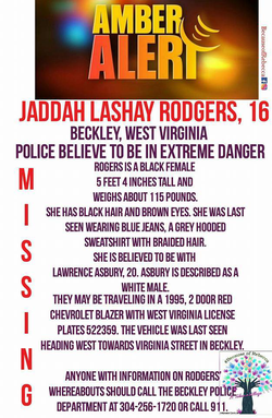 On December 28th, an AMBER Alert was created for Rodgers. She was abducted from a Walgreens parking lot on Byrd Drive in Beckley at 6 p.m. Rodgers was kidnapped by a 20-year-old white male named Lawrence Asbury. [1]