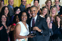 Jahna Hayes being honored by Barack Obama after being named National Teacher of the Year in 2016. [1]