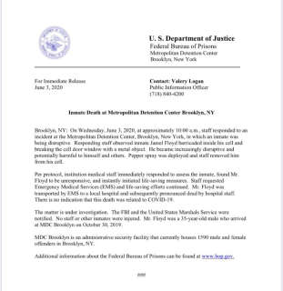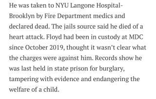 Floyd was initially held at Metropolitan Detention Center, Brooklyn since October of 2019 on unclear charges. [1] Floyd was later taken to the NYU Langone Medical Center in Brooklyn and declared dead by Fire Medics. Some even arranged a march to MDC for both George & Jamel Floyd to take place on 44th Street & 6th Avenue, Sunset Park, Brooklyn on Friday, June 6.