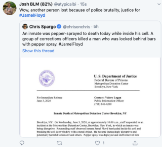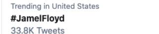 Floyd's death quickly rose on Top 5 trending on Twitter with #JamelFloyd, days after the killing and nationwide protests of George Floyd in Minneapolis by police officer Derek Chauvin (Police Officer). With users still reeling from the death of George Floyd, they referred to Jamel's death as "murder" and "torture".