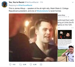 When asked about being seen as part of the Neo Nazis by the Twitter account, Yesyoureracist, he responded with the following: "They have no proof that I'm a racist," Allsup said. "They are slandering me and that I'm racist without evidence because I talk about history and I talk about American politics."