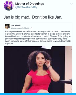 Jan Shedd, Tea Party activist and Texas' Kaufman County, created a post on facebook where she denounced the hiring of ABC Dallas' new hire, Demetria Obilor, for wearing skimpy clothing.