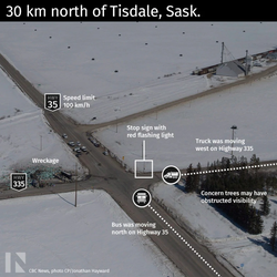 He was heading westbound on Highway 335 in a semi as a Charlie's Charters bus carrying the Humboldt Broncos was travelling northbound on Highway 35 to an SJHL playoff game in Nipawin, Saskatchewan.