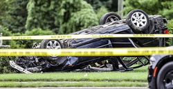 The driver crashed through a fence, and the car flipped over.