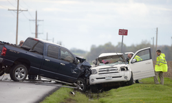 The white vehicle was traveling northbound, and the blue truck was traveling southbound when the accident occurred.