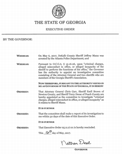 On May 11, 2017 Georgia Governor Nathan Deal signed an executive order to investigate Jeffrey Mann's conduct. The investigation would conclude with a report in 30 days. Mann could face an up to 90 day suspension based on the findings of the report.