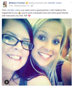 Jennifer Jones (1996 - January 14, 2017) was a student at Tallahassee Community College. Friends remember her for being a beautiful and good person who was friends with everyone. [1]