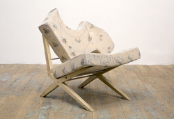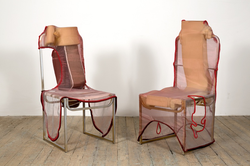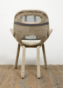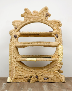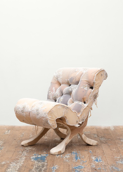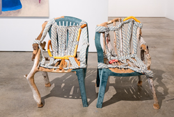 She customarily builds on found frames of chairs, couches, and shelves to create sculptural artworks that double as functional furniture.
