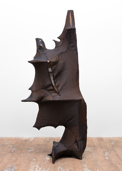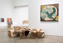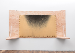 From bulging, stained upholsterer’s foam to patterned and embroidered fabric, the imperfect and ornamented surfaces of Reaves’ sculptures often reimagine functionalist design and lend each object an unexpected animacy that exceeds its original use.