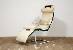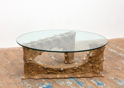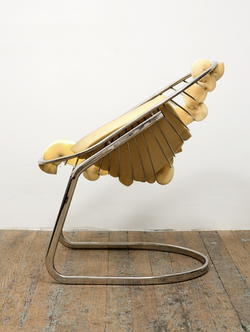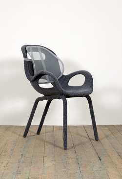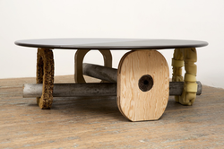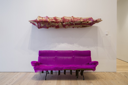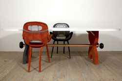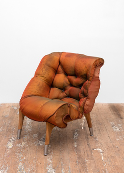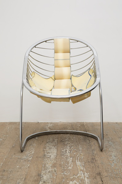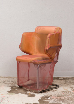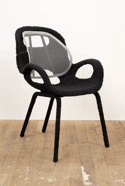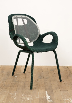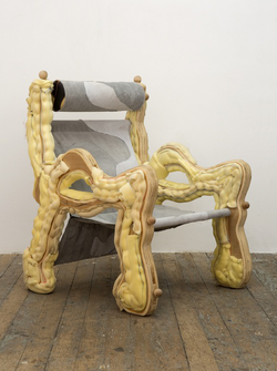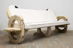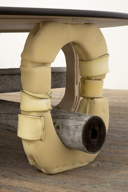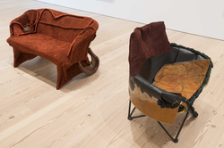 Before becoming an artist she worked part-time as an upholsterer, and now she makes sculptures that function as furniture: chairs, tables and sofas created from startling blends of foam, sawdust, plywood, plexiglass and auto parts.