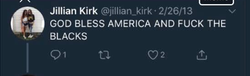 In March 2018, Kirk came under public scrutiny for her repeated use of the term nigger and other racist language on social media.