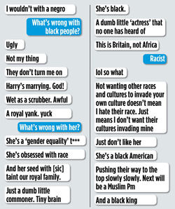 Jo Marney complained that the ‘black American’ fiancee will ‘taint’ the Royal Family with ‘her seed’ and pave the way for a ‘black king’.