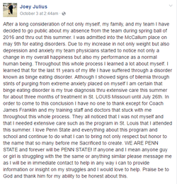 [11]Julius credits that Penn State coaching staff and trainers for noticing his illness and is grateful for the support of the Penn State community.