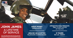 At the age of 17, John James made the decision to join the United States Military. After graduating from West Point in 2004, he became a Ranger School-qualified Aviation Officer in the United States Army. John went on to serve with distinction in Operation Iraqi Freedom where he earned a Combat Action Badge (CAB) and two Air Medals, among other awards, while logging 753.8 flight hours in theater (warfare) leading two Apache Helicopter platoons. After eight years of service to the nation, John James was honorably discharged. [undefined] [undefined] [undefined]