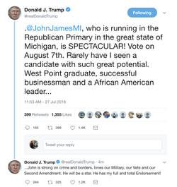 On July 27, 2018, John James was endorsed by President Donald Trump in two tweets. [undefined] [undefined] [undefined] [undefined]