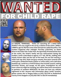 John Lamb III is a resident of La Vergne, Tennessee. He is known for being the rapist of a child. [1] The child was a relative, and when he was caught in the act, he fled the scene. He faces the following charges: 4 counts of Aggravated assault, Aggravated assault with a weapon, aggravated rape, incest, evading arrest, resisting arrest, and retaliation for past action.