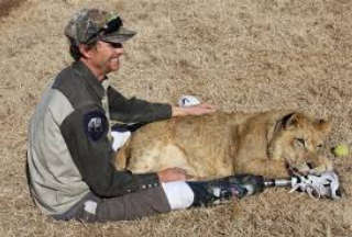 The doctors had to cut his right leg in September 2009 but in 10 days he was back at work with two prosthetic legs. John Reinke grew extremely attached to other animals in the zoo, including a lion called Bonedigger who also developed an unlikely relationship with Milo, a Dachshund.[11][10]