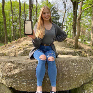 She has green eyes and blonde hair.