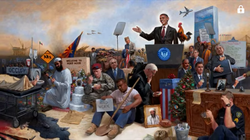 The scenes include nationalistic depictions: a male or female soldier by the flag, armed pioneers and Native Americans in a Western scene, white people "under God", a series of religious scenes, landscapes, and his most famous painting of white people and historic figures in front of the Capitol Building with Barack Obama standing on the U.S.