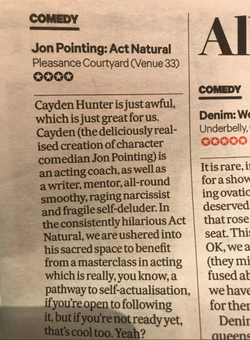 Pointing has three writing credits to his name for the short films Life Guru (2012), The Last Day (2015), and Double Act (2017). [13] He has acting credits for Life Guru (2012), The Phone Call (2013), The Last Day (2015), @Elevenish (2016), Damned (2016), Liam Williams' Valentine (2017), Double Act (2017), Pls Like (2017), and The Great Unwashed (post-production). [13] Pointing writes and stars in the play Act Natural. He plays, Cayden Hunter, disillusioned egotistical and ultimately tragic acting coach. The show premiered at the Edinburgh Fringe Festival in 2017. [18]