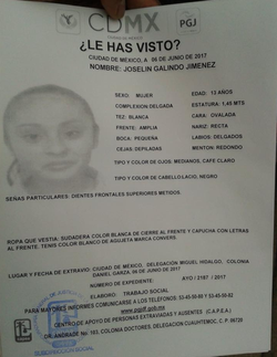 Fue vista por última vez al salir de su casa, ubicada en la delegación Miguel Hidalgo el Junio 6 de 2017.