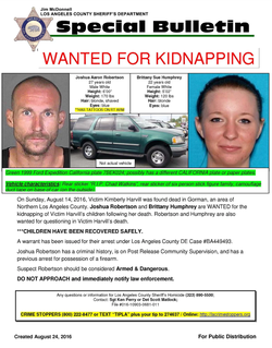On August 14, 2016 Joshua Robertson and Brittany Humphrey fatally shot Kimberly Harvill and kidnapped her three children. [2]