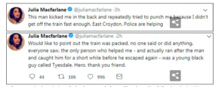 The incident happened as she was getting off at East Croydon station in South London. When the train pulled into station, a man started pushing Julia as if she was in the way as he was trying to exit. "I turned around and said, ‘mate, I’m getting off at the next stop too,'" Julia told MailOnline. The man responded with, "how the f*** was I supposed to know that?"[16]