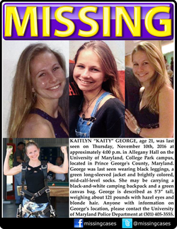 On November 10, 2016 Kaitlyn George was reported missing. Before going missing she was last seen leaving her dormitory, Allegany Hall at 4 p.m that day to go on a camping trip with her boyfriend. [1]