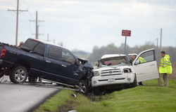 The white vehicle was traveling northbound, and the blue truck was traveling southbound when the accident occurred.