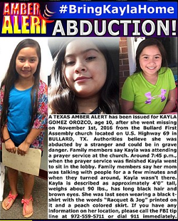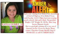 On the evening of November 1, 2016, Kayla Gomez and her mother attended a vigil at Bullard First Assembly off U.S. Highway 69. When the vigil ended, Kayla was sitting in the lobby while her mother talked to others in attendance for a few minutes and when she turned around Kayla was not there.