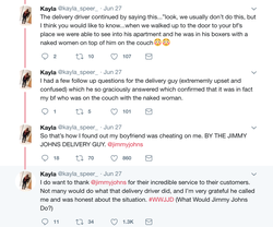 On June 17th, 2018, Speer posted a thread of tweets regarding her experience with Jimmy John's in helping her discover that her long distance boyfriend was cheating on her. [undefined] After she had made an order for delivery to her boyfriend's house with specific instructions as she intended to surprise him. [undefined] The Jimmy John's delivery worker then informed Speer that the guy whom she intended to deliver the food to was in the act of sex with another woman. [undefined]