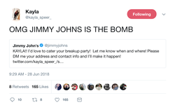 Jimmy John's then responded and have offered to cater her "breakup party".