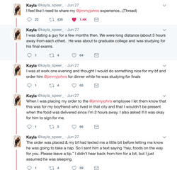 Tweet by Kayla Speer about her experience with Jimmy John.