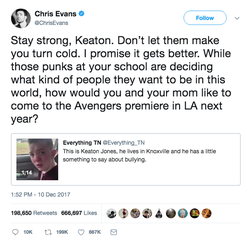 Keaton Jones is a middle school student who resides in Tennessee. Jones received international media attention in December 2017 after a video his mother posted online recounting him being bullied went viral on social media. [1]