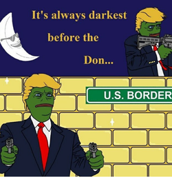Kek has been associated with the Alt-right and Donald Trump supporters who have depicted Pepe the Frog as Trump. As of November 2016, Wesearchr has a $5,000+ bounty secured for a "The Don" themed road sign to be put up.