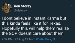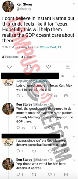 On August 27th, 2017, Ken Storey tweeted a derogatory comment regarding Hurricane Harvey as the karma belonging to Texans for voting for Donald Trump. Newsweek did a report where data shows that many of the counties that were affected by the flood were mostly Hillary Clinton / Democrat voters. The people of twitter responded.