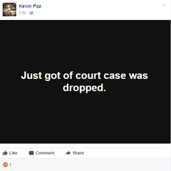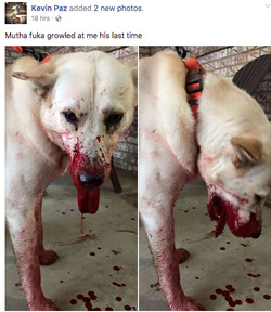 On August 26, 2017 he also posted two photos of a dog with a bloodied muzzle or snout on Facebook. Kevin Paz captioned the photos, "Mutha fuka growled at me his last time." Kevin Paz also made a Facebook post bragging that a court case against him had been dropped, it is unknown whether this was related to his abuse of animals.