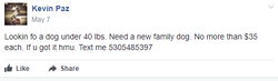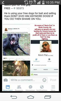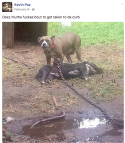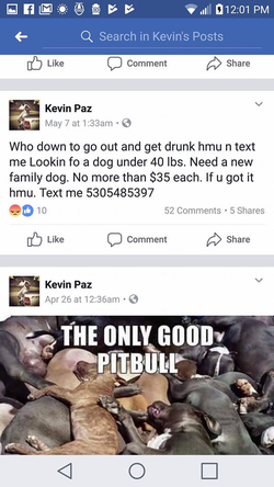 Kevin Paz is well known for posting on his profile and in Facebook groups asking for many cheap dogs usually over 40 lbs. Many social media users believe that he continues to ask for dogs since he is using them for dog fighting and many of his dogs are dying. He also a posted a photo of a meme of a multiple dead pitbulls lying on the ground with the caption "the only good pitbulls".