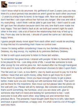 On the evening of December 12th, Lister penned a Suicide note on Facebook. The main topic of the note was his girlfriend of two years, Beth Delaney, who recently ended their relationship. He goes on to elaborate about how he won't be able to get over the situation and that he knows that he is being selfish. Lister gives all of his possessions to Beth, including his bank account, his flat, and whatever material belongings remain in it. His final request is for Facebook not to take the post down because he want's the note to be "an eye opener to the people that are looking for happiness, something I've looked for my whole life."