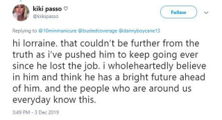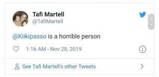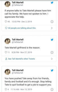 A now deleted Twitter account believed to belong to Tate Martell's mother Tafi posted some cryptic statements about Kiki's Relationship[33] to the family. She first tweeted out early Thanksgiving of 2019 that "Kiki Passo was a horrible person". She followed it up by tweeting that Tate had stopped speaking to the family and that "Kiki was the reason". She also said that Kiki was trying to get Tate to quit football and get a job to support her. When someone on Twitter questioned whether Kiki was encouraging Tate to quit football, she chimed into the conversation to say: [29]