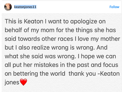After many black celebrities supported her son, it was discovered that Kimberly had made Facebook posts disparaging the Black Lives Matter movement. Keaton posted on Instagram apologizing for his mom's actions.