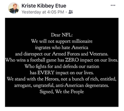 "Dear NFL, The Facebook post by Kriste Kibbey Etue about the NFL protests by dozens of players. we will not support millionaire ingrates who hate America and disrespect our armed forces and veterans. Who wins a football game has ZERO impact on our lives. Who fights for and defends our nation has EVERY impact on our lives. We stand with the heroes, not a bunch of rich, entitled, arrogant, ungrateful, anti-American degenerates. Signed, We the People." [13]